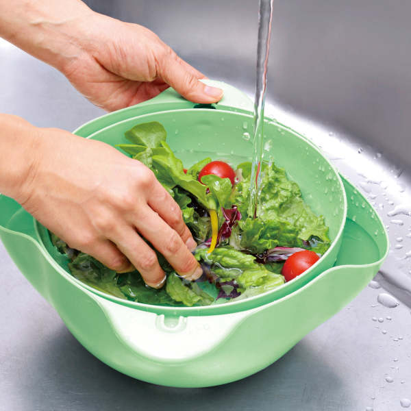 ボウルを回転させてドーム状にすれば、しっかり振って水切りもできます。