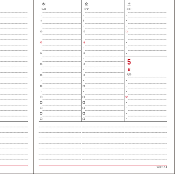 縦に時間ごとの目盛りが用意されたバーチカルレイアウト。時間を細かく区切って管理しやすいのが特徴で、仕事で時間刻みのアポイントが入る営業職の方や、隙間時間を見つけて効率をあげたい方にもおすすめです。