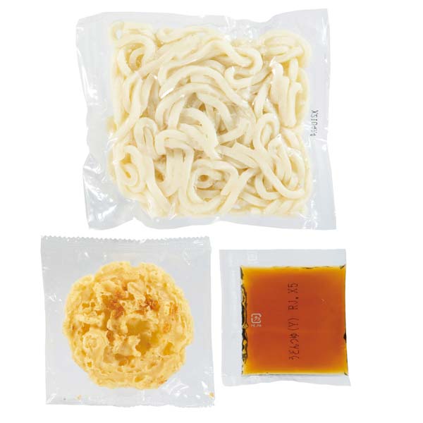 ゆでうどん180g×2、関東風つゆ30g×1、関西風つゆ29g×1、かきあげ天13g×1、味付けあげ35g×1