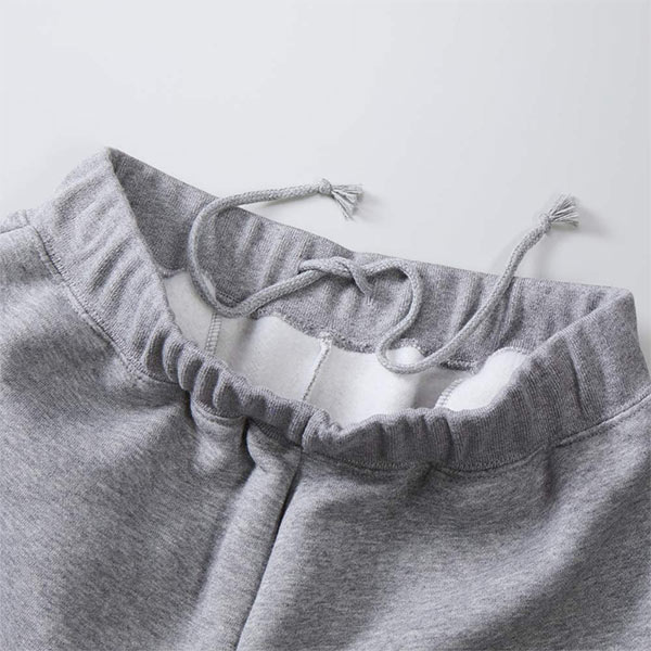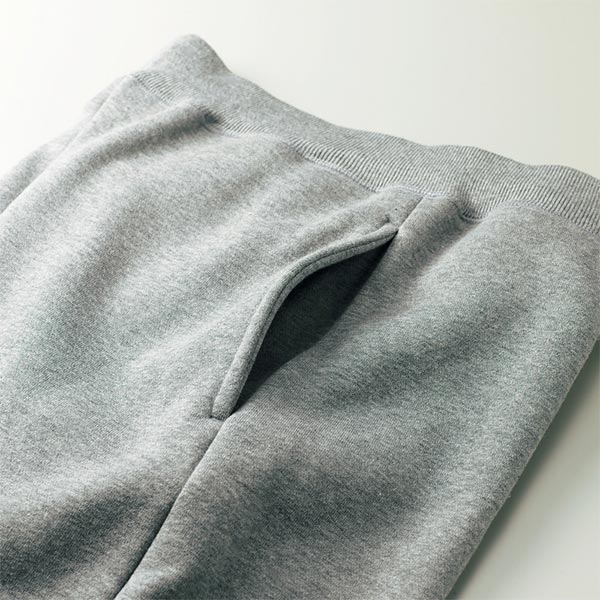 サイドポケットがあり、ウエスト部分は内側の丸ひもによって調整が可能、裾下はリブ仕様になっています。身頃とリブのつなぎ部分はまたぎ2本針ステッチが入っているのでカジュアルな印象です。