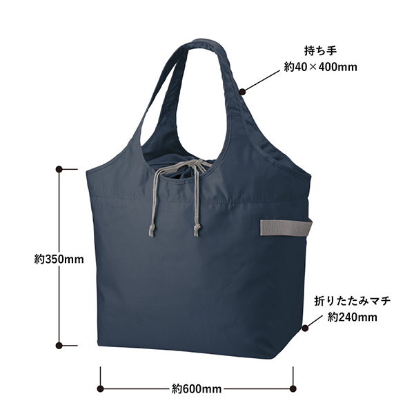 巾着仕様となっている口元は大きく開くことができるので物の出し入れがしやすく、外側についているベルトは車からの荷降ろしや少し手を開けたい時に、傘等を引っ掛けることが出来るなど、機能性にこだわったお買い物バッグです。