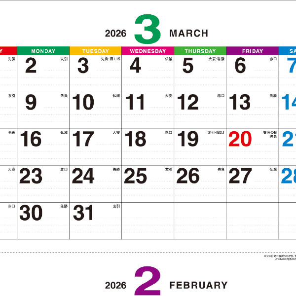 六曜や二十四節気に加えて土用や節分などの雑節も掲載されています。