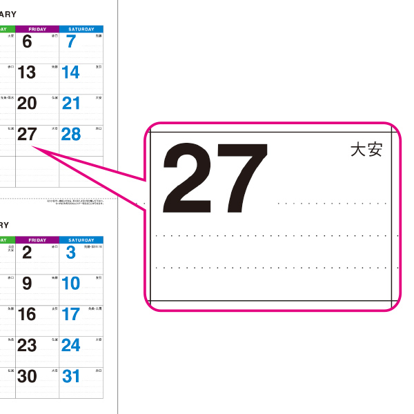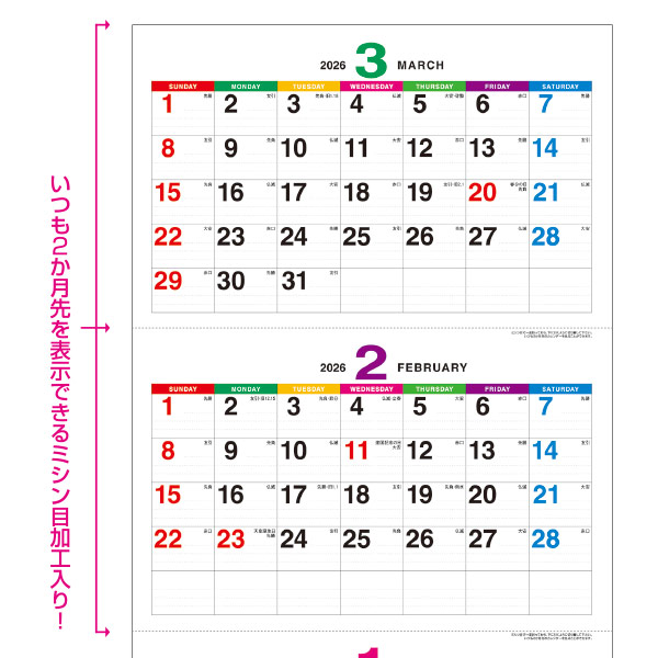 いつも2ヶ月先を表示できるミシン目加工入りの壁掛けカレンダーは、スケジュール管理がしやすく実用的です。