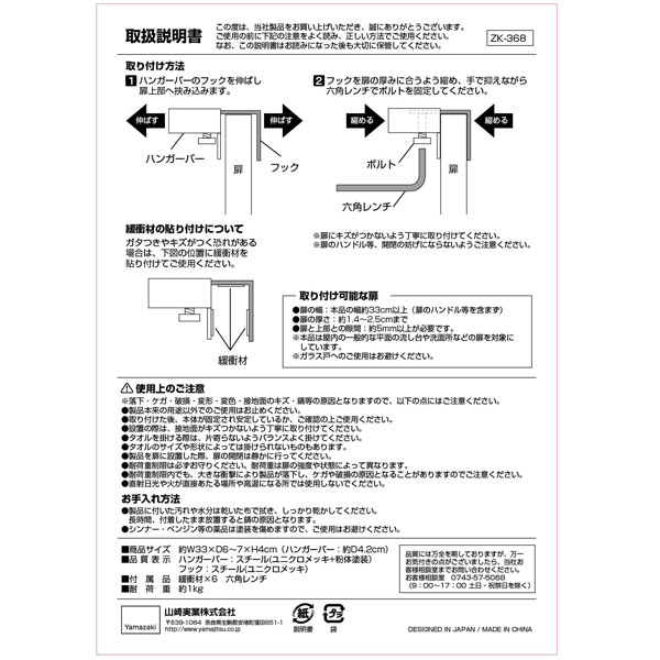 | 材質: | バー/スチール(ユニクロメッキ+粉体塗装)、フック/スチール(ユニクロメッキ) |