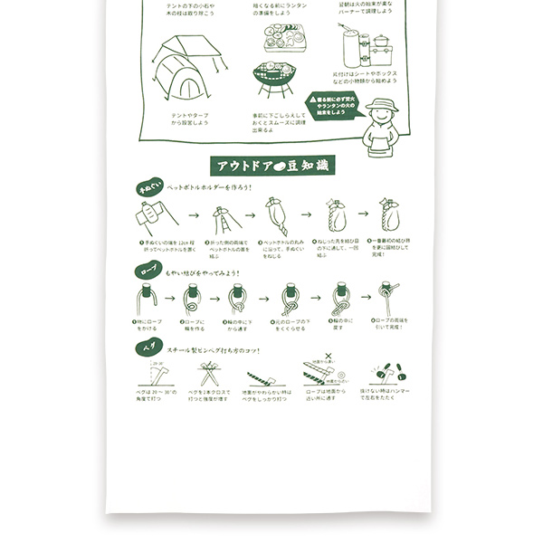 「キャンプの過ごし方」「手ぬぐい豆知識」「もやい結び」「ペグの打ち方のコツ」など役立つ知識を盛り込みました。