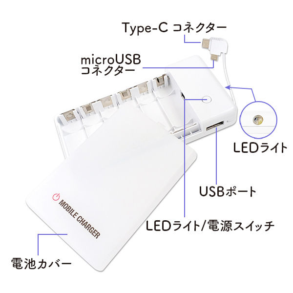 収納式マルチコネクタケーブル(microUSB・Type-C)搭載で、iPhone・スマホどちらでも使用可能!(※Lightningケーブルは別売です)