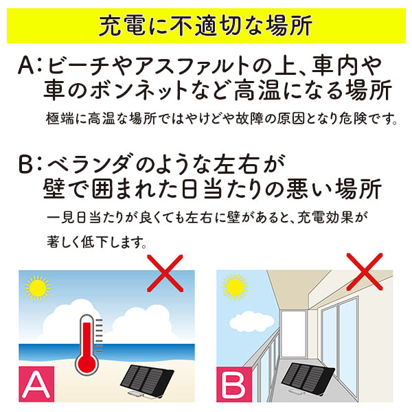 ・パネル全面に太陽光が当たるようにし、太陽光に合わせて推奨角度に設置すると効率よく充電ができます。