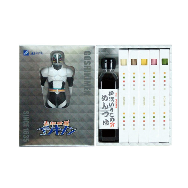 「素麺戦隊ゴシキメン」フィギュア、「手延五色そうめん」、「手延五色そうめん色束別」、「伊吹いりこのめんつゆ」をセットにしました!