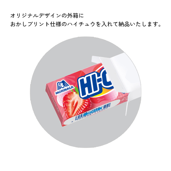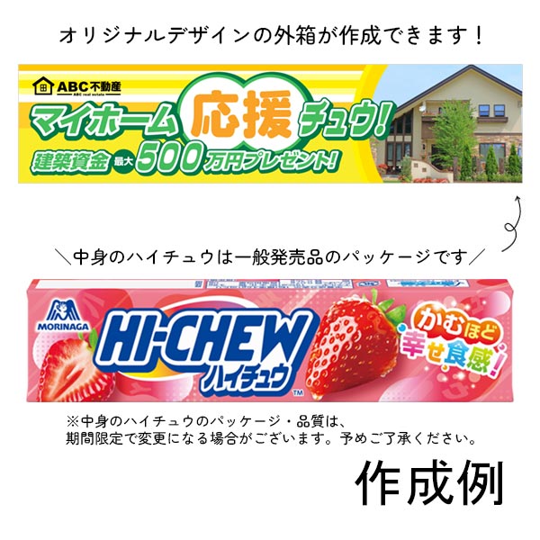 専用の箱にオリジナルデザインでの名入れが可能で、その箱の中に一般発売品のパッケージのハイチュウ(ストロベリー)を入れて納品いたします。