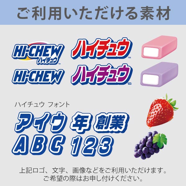 「ハイチュウ」を入れる外箱にオリジナルデザインで名入れ可能! 長年愛されるお菓子のノベルティはいかがでしょうか。