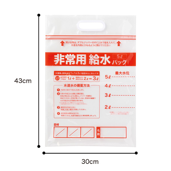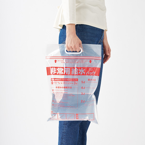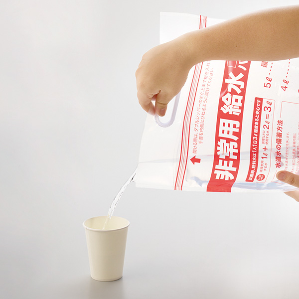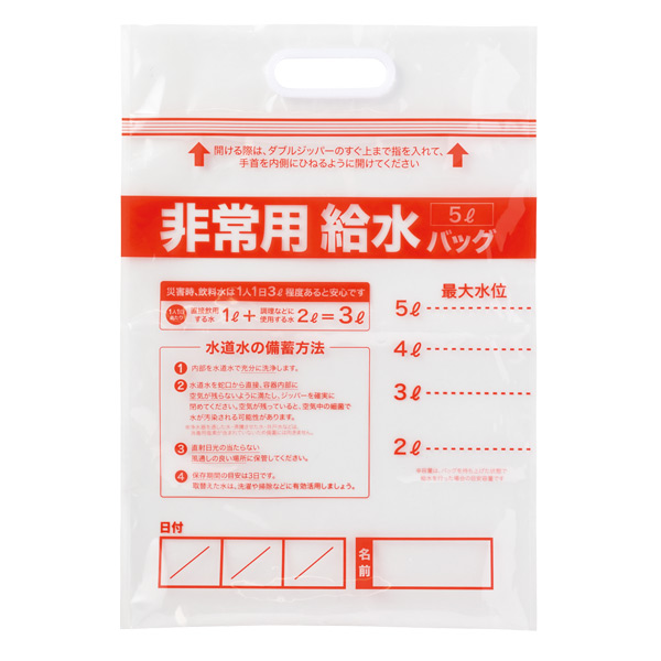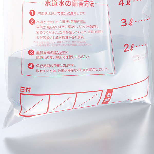 給水バッグには水道水の備蓄方法に給水日・名前記入欄、そして内部の残容量の目安がわかる目盛りもプリントされています。