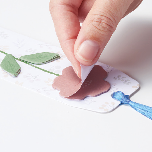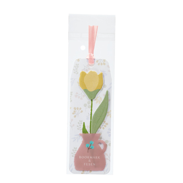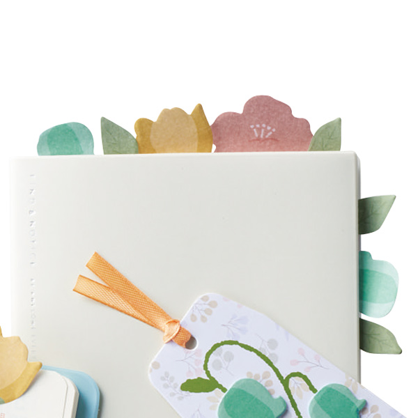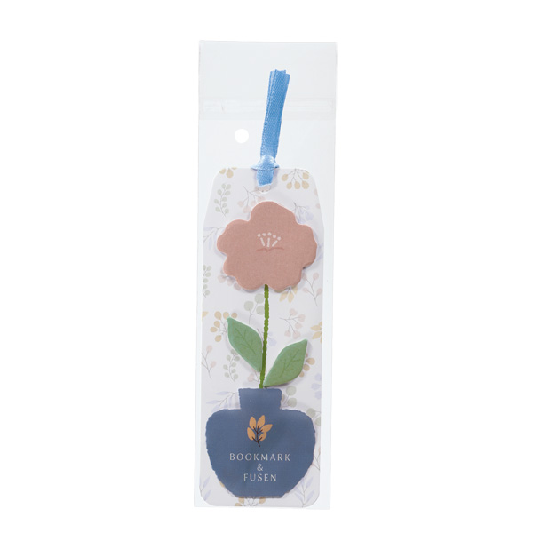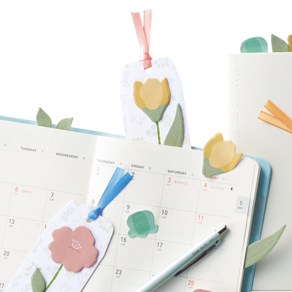 メモ書き用の花型、印付け用の葉っぱ型、2種の付箋がセットの押し花風のしおり付箋です。