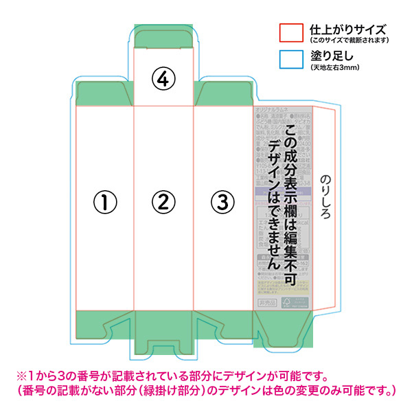 | 場所: | オリジナルデザイン外箱(表面・側面)※裏面の成分表示は編集不可のため、デザインはできません。 |