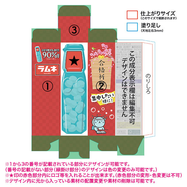 名入れ位置/合格祈願(1から3の番号が記載されている部分にデザインが可能です。番号の記載がない部分(緑掛け部分)は色の変更のみ可能です。★印の赤色部分にはロゴ等の名入れが可能です。)