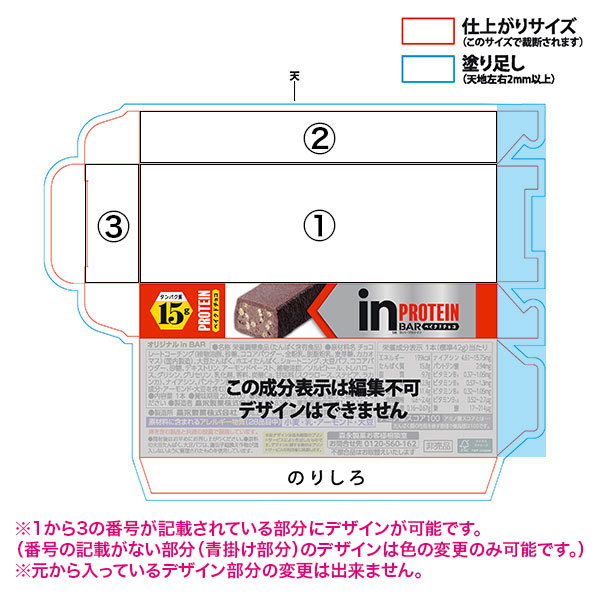 - ■場所: オリジナルデザイン外箱(表面・側面)※成分表示・のりしろ・既デザイン部分は編集不可のため、デザインはできません。
