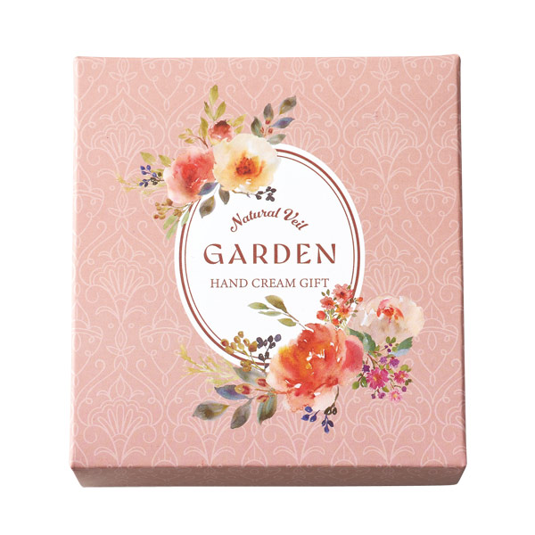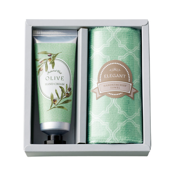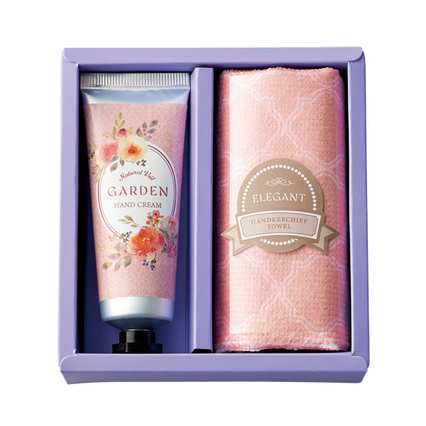 ナチュラル感のある香りのハンドクリームと、エレガント模様のハンカチタオルのセットです。