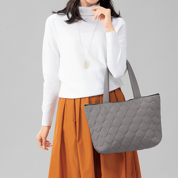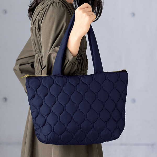 軽量で肩掛けもでき、つかいやすいキルティングトートです。