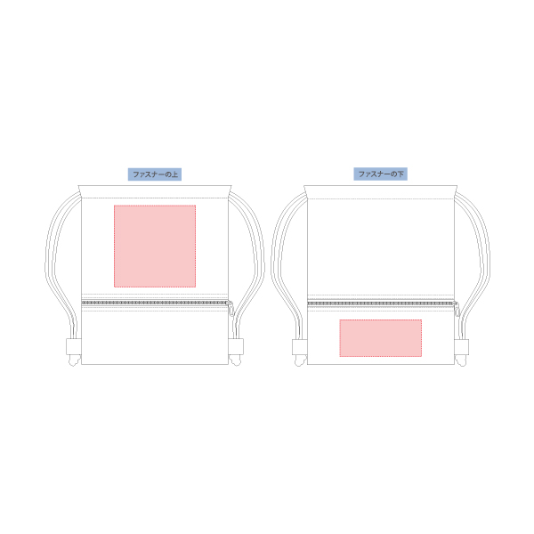 - ■可能サイズ: 【シルク印刷】ファスナーの上/縦190×横200mm、ファスナーの下/縦90×横180mm、【DTF印刷】ファスナーの上/縦200×横200mm、ファスナーの下/縦90×横200mm