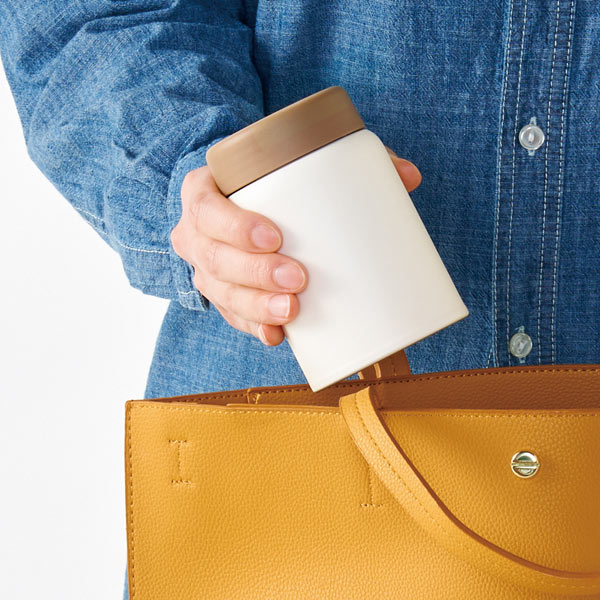 名入れが映えるオフホワイトのボディにベージュの蓋がナチュラルな雰囲気。