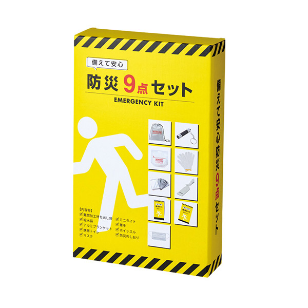 防災アイテムとして特に需要の高い給水袋(3L)と携帯トイレを含む充実の9点セットです。