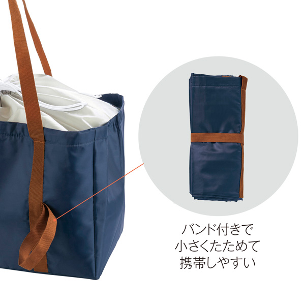 たくさん買っても安心の巾着仕様、肩にも掛けられる長めのハンドル、携帯しやすい折りたたみ式とうれしいポイントがたくさん!