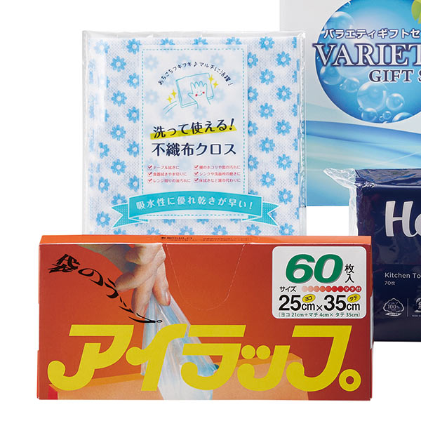アイラップ60枚、エコ手提げポリ袋2枚、ハローキッチンペーパー70枚、洗って使える!不織布クロス1枚