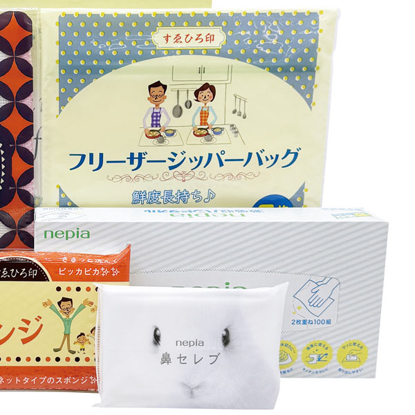ネピア激吸収ハンドタオル100W×1、P&G除菌ジョイコンパクト170ml(さわやか微香)×1、ライオンCHARMYMagica220ml(除菌プラス)×1、ネピア鼻セレブポケットティシュ12W×1、ネットスポンジ×1、フリーザージッパーバッグ5枚×1、かや織りふきん×1