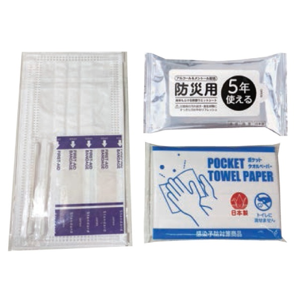 5年使える防災用 除菌ウェットシート10枚×1、ポケットタオルペーパー×1、マスク×1、絆創膏Mサイズ×2、両軸綿棒×2