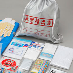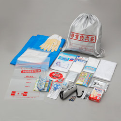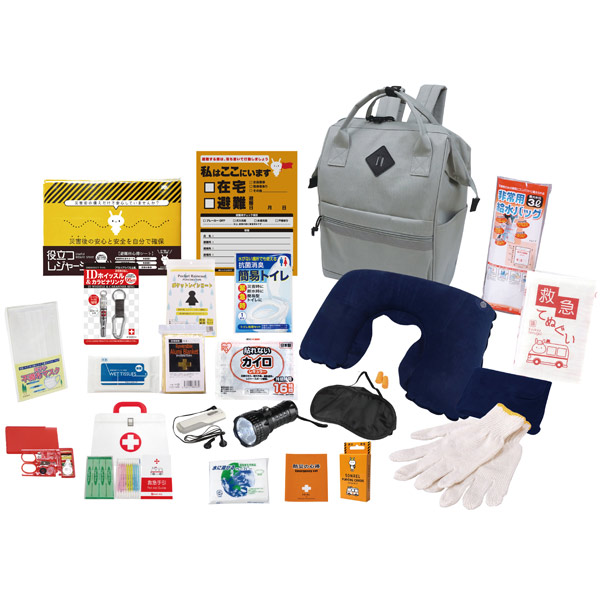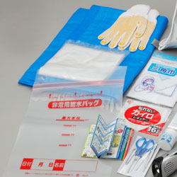 非常袋、非常用給水バッグ5L、すべり止め手袋、ゴミ袋45L(10枚)半透明、ラジオライト、単4マンガン電池3本、防災用ウエットティッシュ20枚、防寒シート、タオル200匁、救急絆創膏2サイズ40枚入、ホイッスル、ブルーシート2畳用、三角巾、マスク1枚、カイロ、緊急簡易トイレ、ハサミ、ピンセット、耳かき、毛抜き、ガーゼ、伸縮包帯、防災ガイド