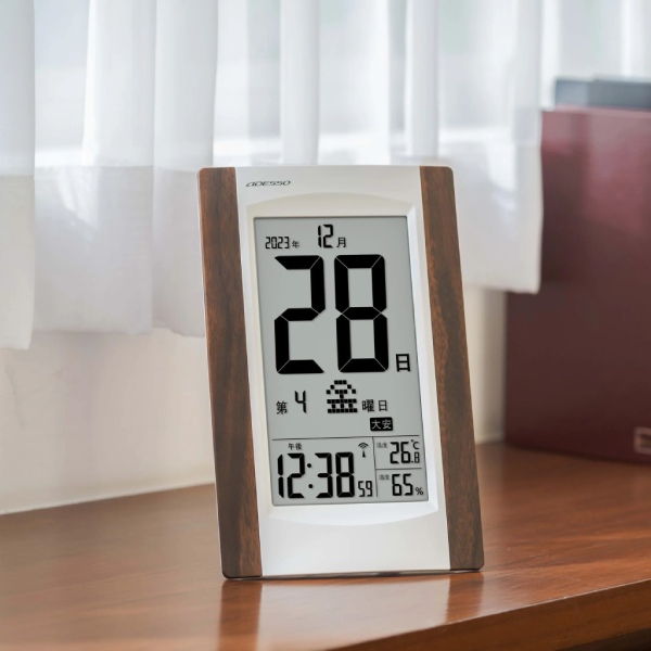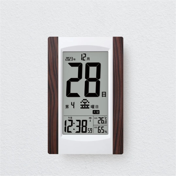 電波、日付、温湿度、六曜、第何曜日表示、アラーム、スヌーズ、置掛兼用、記念日設定(18日分)