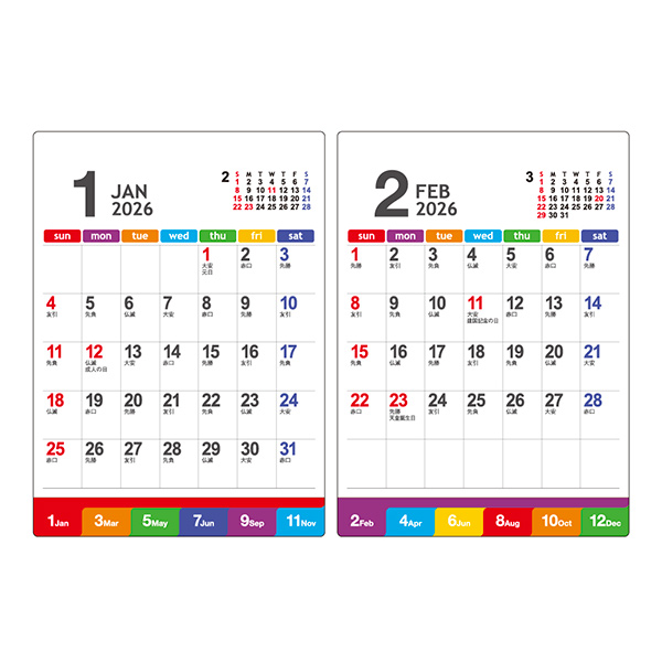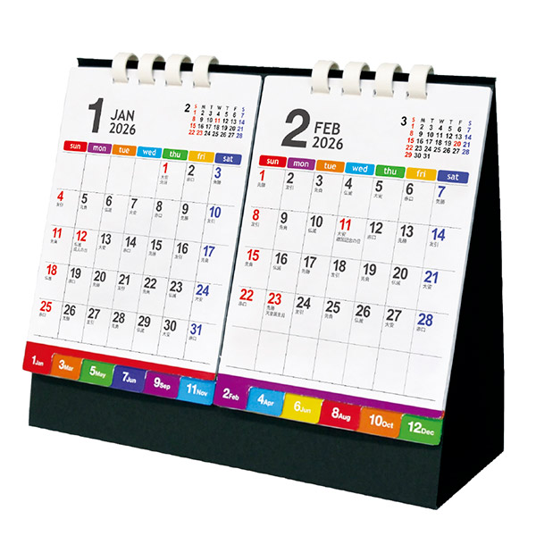 便利なインデックス付き。カラフルで月や曜日が見やすいデザイン。