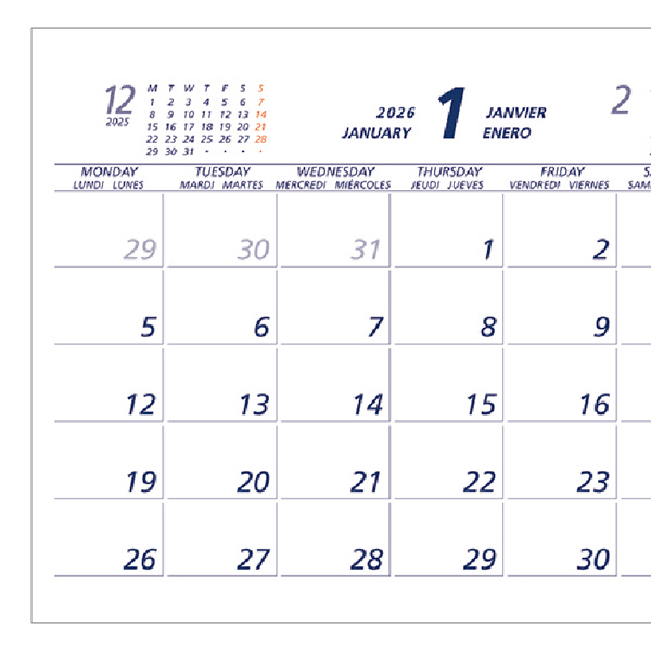 裏面の月と曜日は3ヶ国語表示(英語・フランス語・スペイン語)になっています。