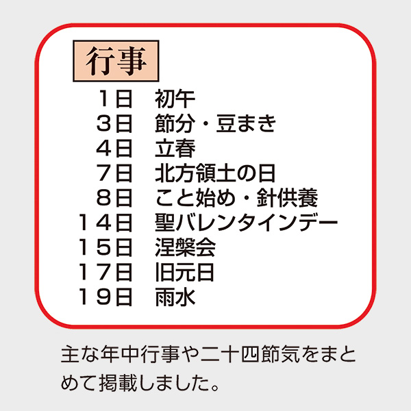 カレンダー本文には月ごとの年中行事や二十四節気・暦の機能などもまとめて掲載。