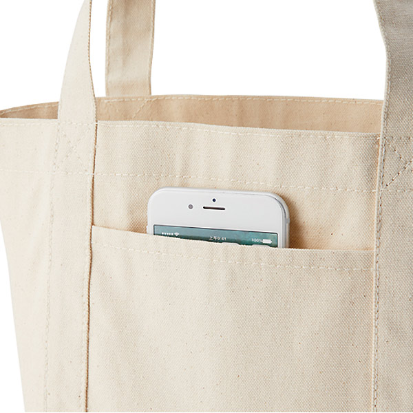 表面にスマートフォンや小物が入るポケット付で、旅行などのサブバッグとして重宝していただけるサイズ感。