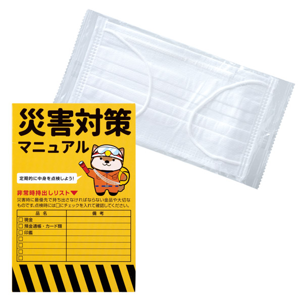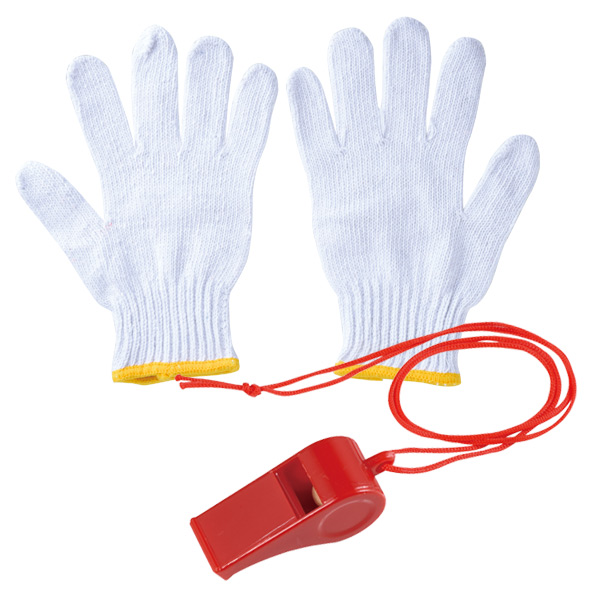 - ■材質: 袋/ポリエステル、マニュアルカード/紙、LEDライト/ABS、アルミシート/アルミ蒸着PETフィルム、マスク/PP、軍手/綿、笛/PS