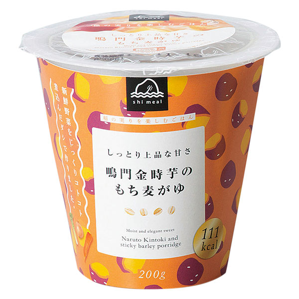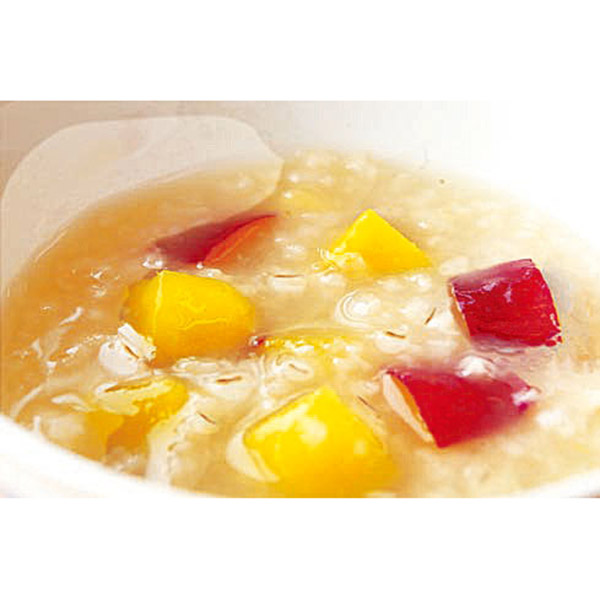 新鮮野菜をじっくりコトコト煮込んだダシで作った、しっとり上品な甘さの鳴門金時入りもち麦がゆです。