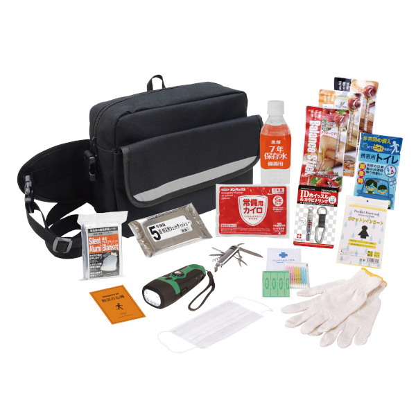 収納バッグ、IDホイッスル&カラビナリング、静音アルミブランケット、携帯用トイレ1P、レインコート、バランススティック×3、カイロ、マスク1P、軍手、防災の心得、ウェットティッシュ、7年保存水、ダイナモマルチライト、8徳ナイフ、綿棒&バンソウコウ