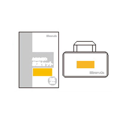 収納ポーチ、折りガーゼ、カイロ、マスク1P、絆創膏5P、綿棒10P、包帯、テープセット、ワンタッチ包帯、除菌ジェル×3、救急てぬぐい、除菌アルコールウェットティッシュ、爪切り、爪やすり、毛抜き、はさみ