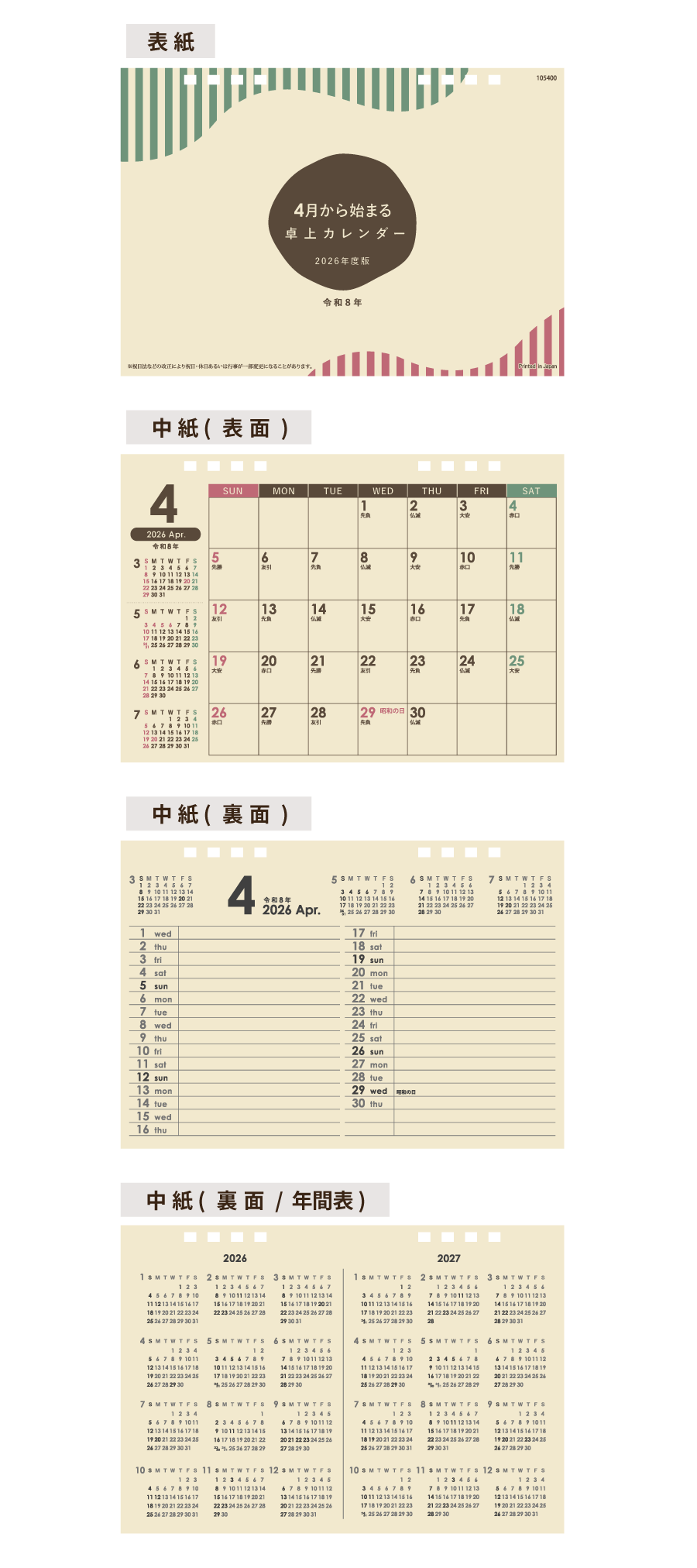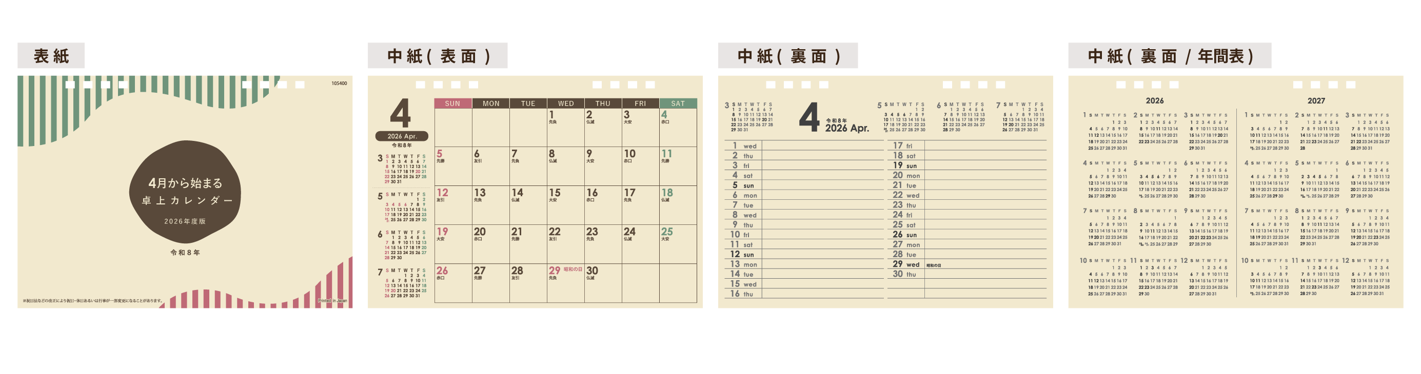 品番:105400 4月から始まる卓上カレンダー2026年度版
