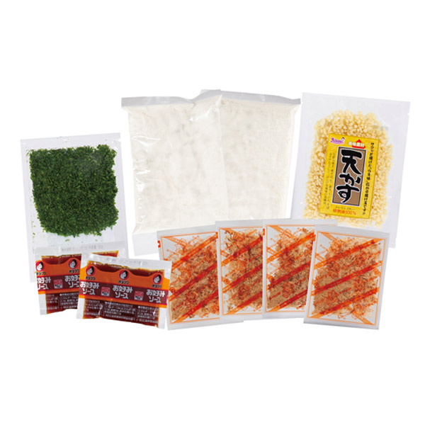 たこ焼き粉ミックス粉200g×2、かつお節2g×4、天かす40g×1、アオサのり5g×1、オタフクソース50g×2