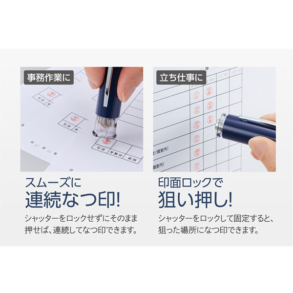 シャッターをロックせずにそのまま押せば、連続してなつ印でき、シャッターをロックして固定すると、狙った場所になつ印できます。