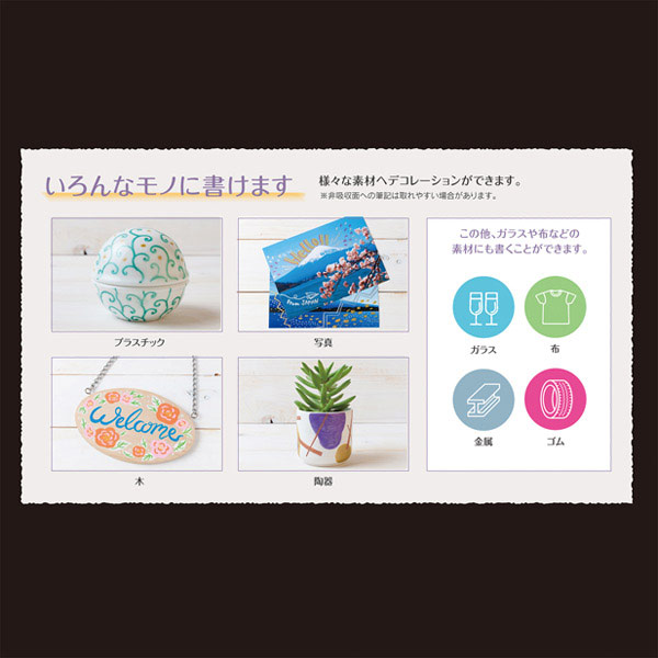 ◆様々な素材へのデコレーションが可能。ガラスや布、金属などにも書くことができます。(※非吸収面への筆記は取れやすい場合はあります。)