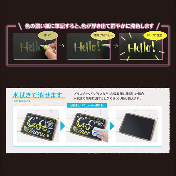 ◆プラスチックやガラスなどの非吸収面に筆記した場合、水拭きで簡単に消すことができ、繰り返し使えます。