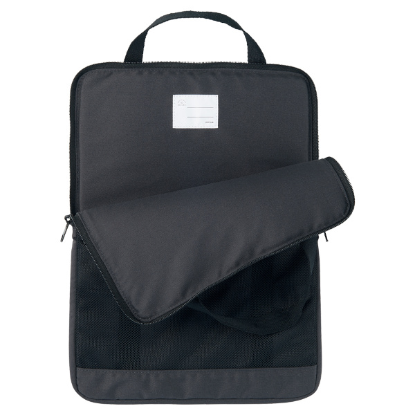 前面には小物が収納できる便利なポケットがあり、ポーチ内側にはネームタグも付いています。