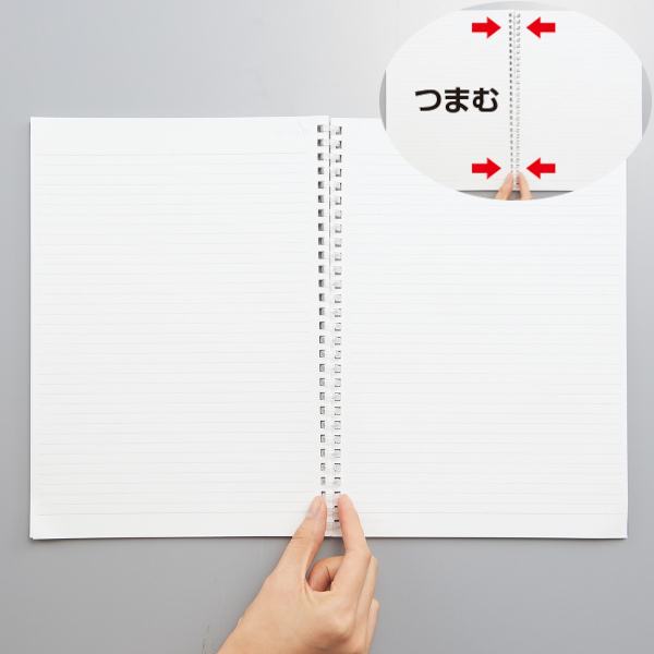 左右それぞれのリーフを上下斜めに軽く引くだけでとじ具が開き、閉じるときは上下のリングを(2個ずつ)つまんで閉じるだけの簡単操作!