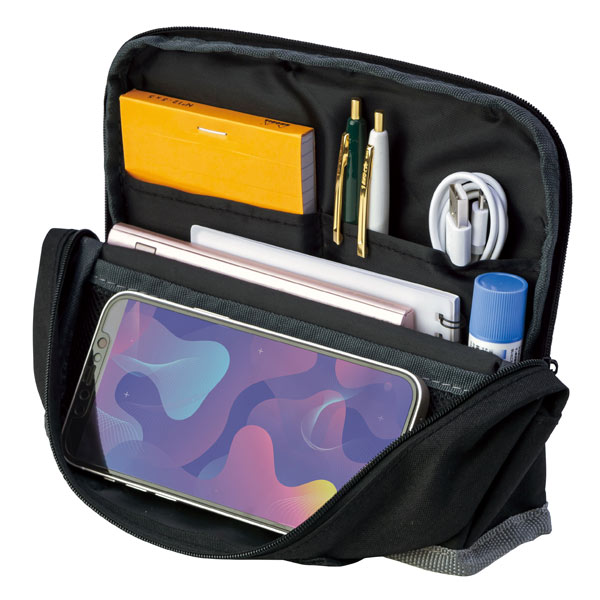 モバイル周辺機器や文具の収納&スマホスタンドにもなる多機能なポーチ。