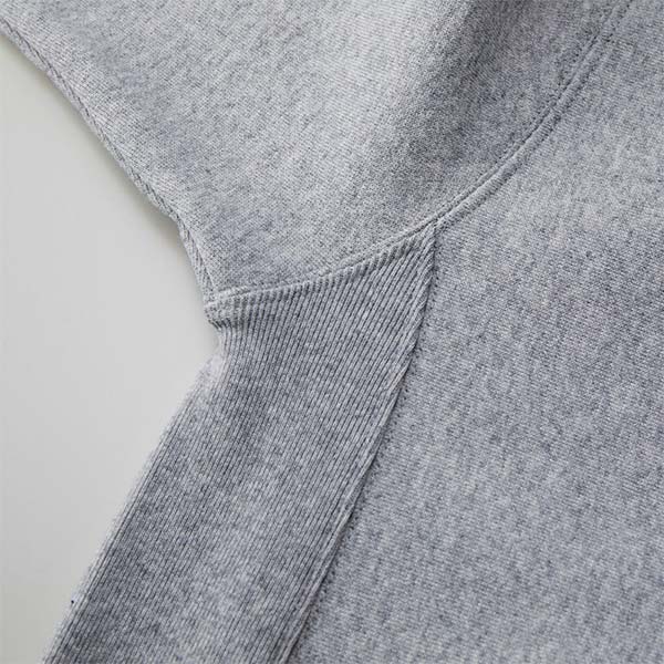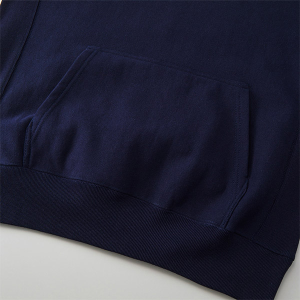 カンガルーポケット仕様、身頃とリブのシームラインは丈夫なダブルステッチ