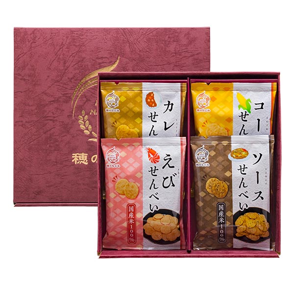 ◆内容量/えびせんべい15g×1個、コーンせんべい15g×1個、ソースせんべい15g×1個、カレーせんべい15g×1個