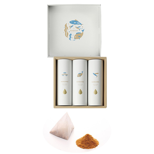 上質感あふれるパッケージに「かつお、たい、あご」の3種類のだしパックを詰め合わせました。
