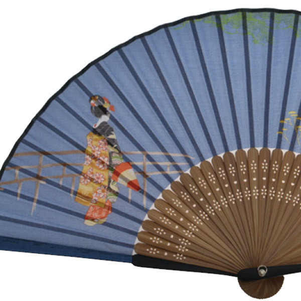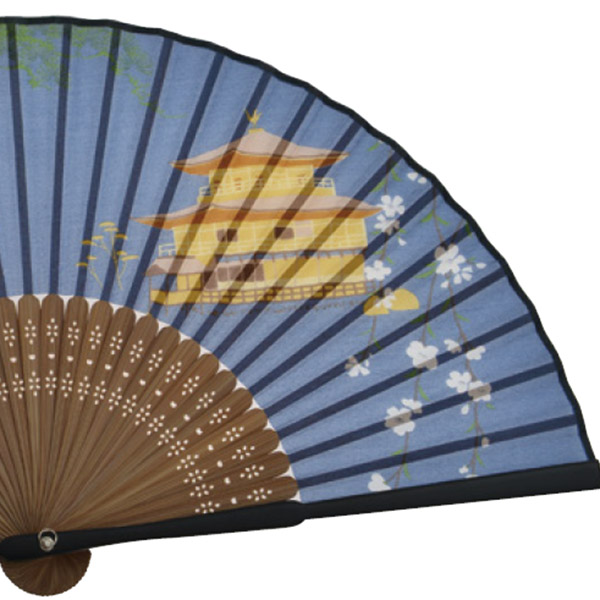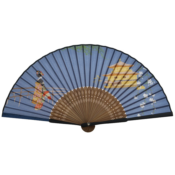 品番:115213 婦人用シルク扇子 金閣寺と舞妓はん 青藍